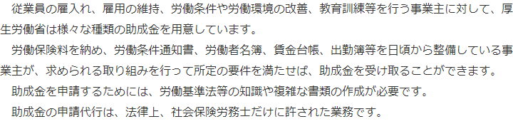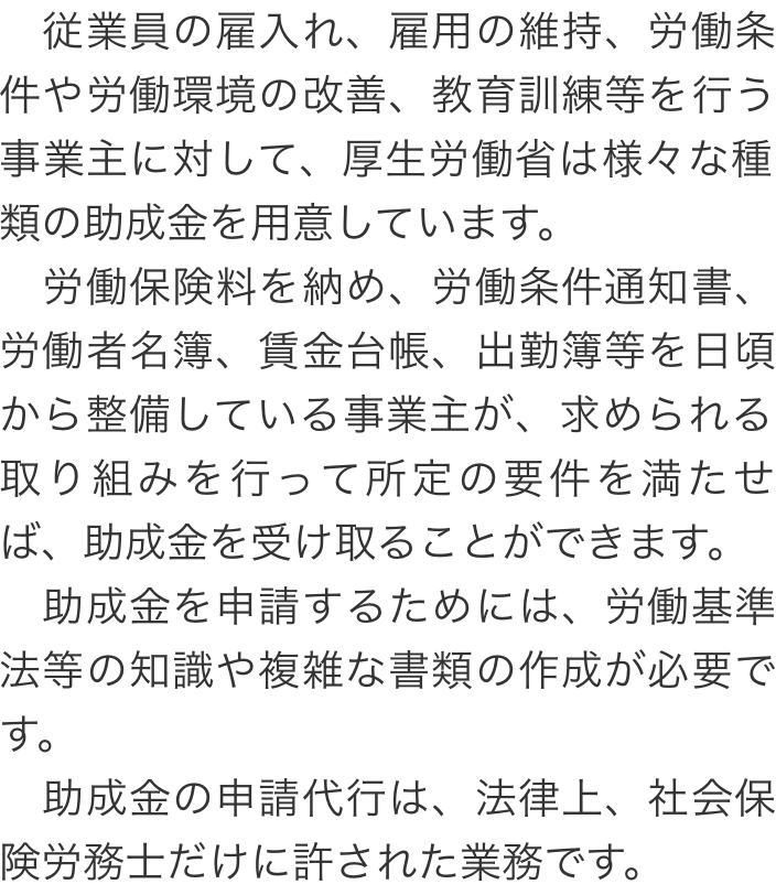 トップ取扱業務助成金の申請 階層構造▼ 取扱業務 目次へ 助成金の申請 就業規則・労務管理労災保険の給付申請 取扱業務(目次)取扱業務トップ障害年金の請求社会保険・労働保険の手続就業規則・労務管理助成金の申請労災保険の給付申請 受付時間 平日 9時~21時、土日祝 9時~18時 夜間・土日祝の相談も対応します(要予約) 所在地 〒271-0092 千葉県松戸市松戸1281‐29京阪松戸ビル3F 0120-86-2403 お問合せ・アクセス・地図