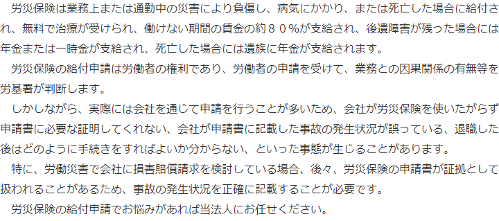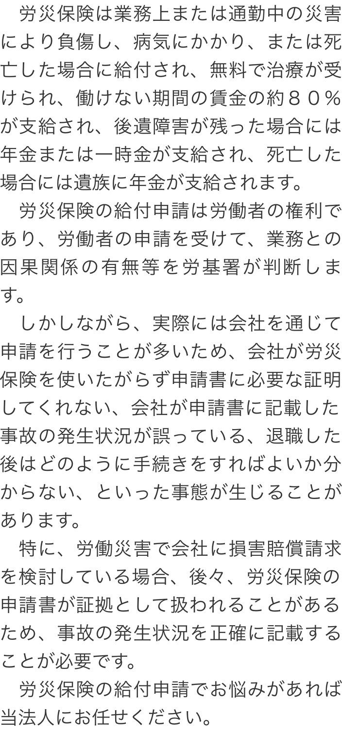 トップ取扱業務労災保険の給付申請 階層構造▼ 取扱業務 目次へ 労災保険の給付申請 助成金の申請 取扱業務(目次)取扱業務トップ障害年金の請求社会保険・労働保険の手続就業規則・労務管理助成金の申請労災保険の給付申請 受付時間 平日 9時~21時、土日祝 9時~18時 夜間・土日祝の相談も対応します(要予約) 所在地 〒271-0092 千葉県松戸市松戸1281‐29京阪松戸ビル3F 0120-86-2403 お問合せ・アクセス・地図
