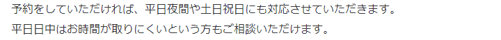 夜間・土日祝の相談も対応します(要予約)